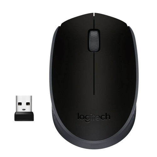 Logitech basic draadloze muis. Voorzien van erg klein usb ontvangertje wat in de laptop USB poort kan blijven zitten. Batterij inbegrepen.
